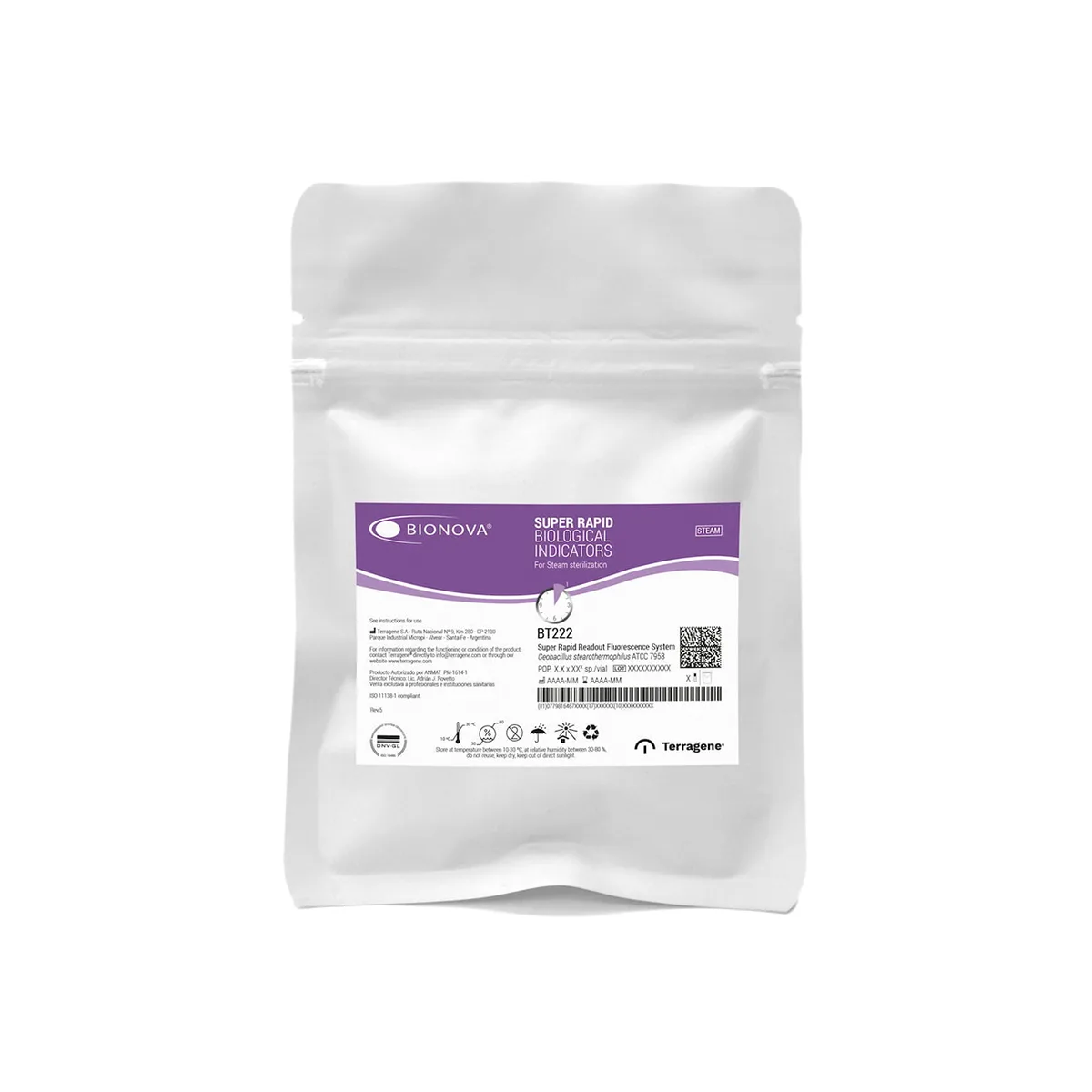 Indicador biológico autónomo súper rápido para procesos de esterilización por vapor. Geobacillus stearothermophilus (ATCC 7953) 10 ^ 6 esporas por vial. Lectura: 1 hora.